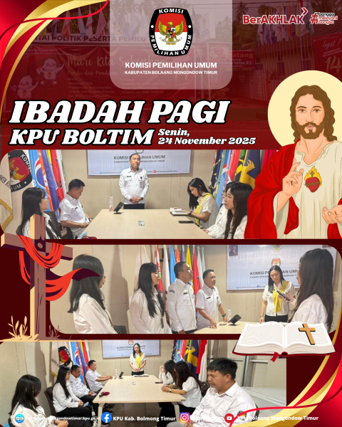 Tutuyan — Komisi Pemilihan Umum (KPU) Kabupaten Bolaang Mongondow Timur kembali melaksanakan ibadah rutin setiap hari Senin bagi pegawai yang beragama Kristen, bertempat di aula kantor KPU Boltim, Senin pagi 24/11/2025. Kegiatan ibadah ini diikuti oleh Sekretaris KPU Boltim dan Seluruh Pegawai yang beragama Kristen, dan merupakan agenda tetap setiap awal pekan sebagai wadah penguatan iman, moral, dan integritas dalam menjalankan tugas Kedinasan. Melalui ibadah ini, para pegawai diajak untuk mengawali minggu kerja dengan hati yang bersyukur, penuh tanggung jawab, dan komitmen pelayanan. Ibadah dipimpin oleh Saudari Cindy Tingehe, dia menyampikan Firman Tuhan yang terdapat dalam Yohanes 12:1-8 dengan judul pembacaan “Yesus di urapi di Betania” yang menekankan pada setiap pekerjaan yang dilakukan harus menjadi pelayanan dan kesaksian, sehingga kinerja aparatur KPU Boltim dapat memberikan teladan dan kontribusi positif bagi masyarakat dan lembaga. Kegiatan ditutup dengan doa bersama, diikuti dengan harapan agar seluruh rangkaian pekerjaan di pekan ini dapat berjalan dengan lancar dan membawa berkat bagi seluruh pegawai serta lembaga KPU Boltim. ....