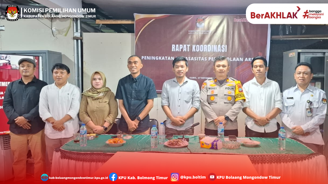 BOLTIM — Dalam rangka memperkuat tata kelola administrasi dan meningkatkan profesionalisme kelembagaan, Komisi Pemilihan Umum (KPU) Kabupaten Bolaang Mongondow Timur (Boltim) melaksanakan kegiatan Rapat Koordinasi (Rakor) Peningkatan Kapasitas Pengelolaan Arsip, dan dilanjutkan dengan Penandatanganan Pakta Integritas sebagai bagian dari pencanangan Zona Integritas (ZI) di lingkungan Satuan Kerja (Satker) KPU Boltim, yang dilaksanakan di Aula Kantor KPU, Kamis 27 November 2025. Kegiatan ini dibuka oleh Ketua KPU, Rusmin Mamonto, dan dihadiri Ketua Divisi Sosialisasi Pendidikan Pemilih Partisipasi Masyarakat dan Sumber Daya Manusia (Sosdiklih Parmas dan SDM) KPU Provinsi Sulawesi Utara (Sulut) Awaludin Umbola. Kegiatan tersebut diikuti para komisioner dan jajaran sekretariat KPU Boltim, serta menghadirkan narasumber, masing-masing Kabag Ops Polres Boltim AKP Wensi Herbel Saerang, S.E, serta Staf Intelijen Kejaksaan Negeri (Kejari) Kotamobagu Rosma Amalia. Dalam arahannya, Awaludin Umbola, menekankan bahwa pengelolaan arsip yang baik bukan sekadar tugas administratif, tetapi pondasi transparansi dan akuntabilitas lembaga kepada publik. Dengan arsip yang tertata rapi dan sistematis, dokumen Pemilihan Umum (Pemilu) dapat dengan mudah diakses saat dibutuhkan, mendukung audit internal maupun eksternal, serta menjaga kesinambungan proses penyelenggaraan Pemilu yang akan datang. “Arsip menjadi sesuatu hal yang kita pelajari dan implementasikan dalam keidupan keseharian kita terlebih khusus dalam pekerjaan kita di kantor,” ujar Umbola. Diakhir kegiatan, dilakukan penandatanganan pakta integritas oleh semua komisioner, sekretaris dan kepala sub bagian di lingkungan sekretariat KPU Boltim, yang disaksikan Ketua Divisi Sosdiklih Parmas dan SDM KPU Provinsi Sulut Awaludin Umbola, serta Kabag Ops Polres Boltim AKP Wensi Saerang, S.E. Penandatanganan pakta integritas itu sebagai bagian dari upaya KPU Boltim dalam menjalankan tugas dengan integritas tinggi, menjaga kepercayaan publik, menjadikan nilai transparansi, serta akuntabilitas sebagai budaya kerja sehari-hari. Melalui kegiatan tersebut, KPU Boltim menegaskan komitmen untuk terus memperbaiki sistem pengelolaan internal, meningkatkan kualitas pelayanan publik, serta memastikan bahwa seluruh kegiatan kepemiluan di wilayah Boltim berlangsung dengan profesional, terbuka dan terpercaya. ....