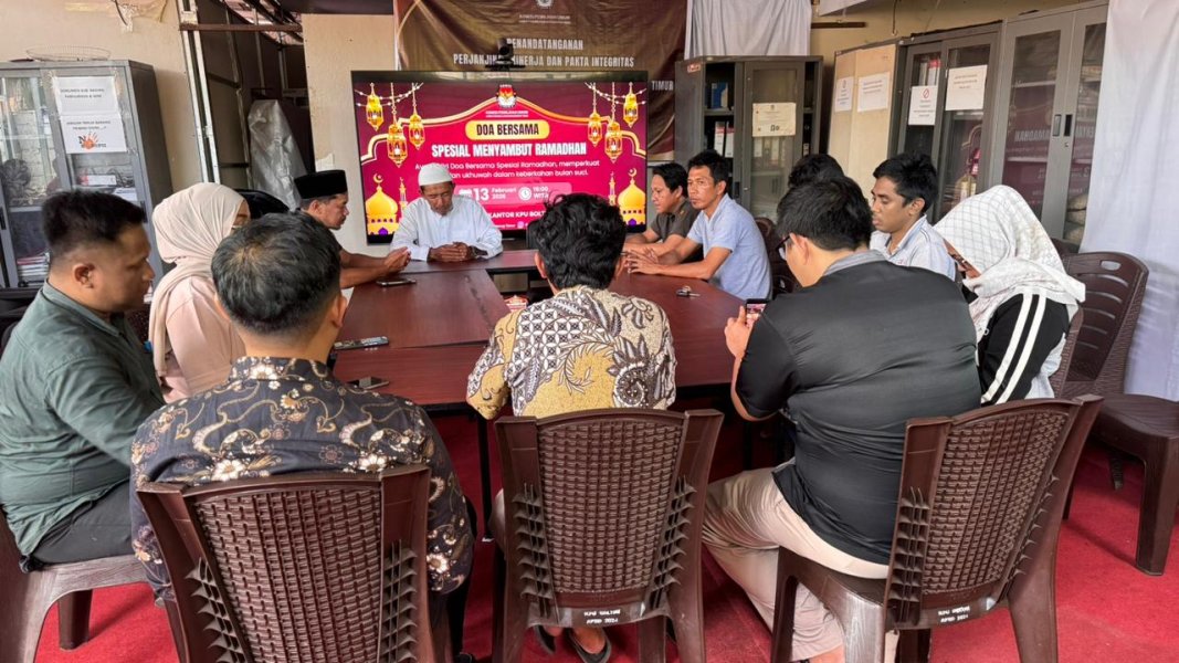 Boltim - Dalam rangka menyambut datangnya bulan suci Ramadan, Komisi Pemilihan Umum Kabupaten Bolaang Mongondow Timur menggelar kegiatan doa bersama yang berlangsung dengan khidmat di lingkungan kantor KPU Boltim. 13/2/2025 Kegiatan ini dihadiri oleh para Komisioner KPU Boltim, Sekretaris, para Kepala Subbagian, serta seluruh staf pelaksana. Doa bersama dilaksanakan sebagai bentuk ungkapan syukur sekaligus harapan agar seluruh jajaran diberikan kesehatan, kekuatan, serta kelancaran dalam menjalankan tugas dan tanggung jawab, khususnya dalam memberikan pelayanan terbaik kepada masyarakat. Dalam suasana penuh kebersamaan dan kekeluargaan, kegiatan doa bersama ini juga menjadi momentum untuk mempererat tali silaturahmi antarpegawai serta menumbuhkan semangat spiritual menjelang pelaksanaan ibadah di bulan suci Ramadan. Melalui kegiatan ini, diharapkan seluruh jajaran KPU Boltim dapat menjalani bulan Ramadan dengan penuh keikhlasan, meningkatkan nilai-nilai integritas, serta terus menjaga komitmen dalam mewujudkan penyelenggaraan pemilu yang berintegritas, profesional, dan berkeadilan. ....