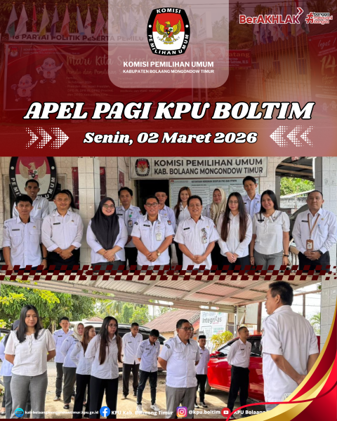 Komisi Pemilihan Umum Kabupaten Bolaang Mongondow Timur (KPU Boltim) melaksanakan apel pagi rutin di halaman Kantor KPU Boltim di pimpin langsung oleh Sekretaris KPU Boltim Dolfie R.S Kereh, S.Sos, M.Si. Apel diikuti oleh jajaran sekretariat sebagai bagian dari upaya menjaga disiplin serta meningkatkan koordinasi internal Lembaga pada Senin (2/3/2026). Dalam arahannya, pimpinan apel menekankan pentingnya kedisiplinan, tanggung jawab, serta profesionalisme dalam menjalankan tugas dan fungsi kelembagaan. Seluruh pegawai diingatkan untuk terus menjaga integritas dan komitmen dalam memberikan pelayanan terbaik kepada Masyarakat. Selain itu, apel pagi juga dimanfaatkan sebagai sarana evaluasi singkat terhadap pelaksanaan tugas minggu sebelumnya serta penyampaian agenda kerja yang akan dilaksanakan dalam waktu dekat. Kegiatan apel berlangsung dengan tertib dan khidmat, serta diakhiri dengan doa bersama sebagai bentuk harapan agar seluruh tugas dan tanggung jawab dapat dijalankan dengan baik dan lancar. ....