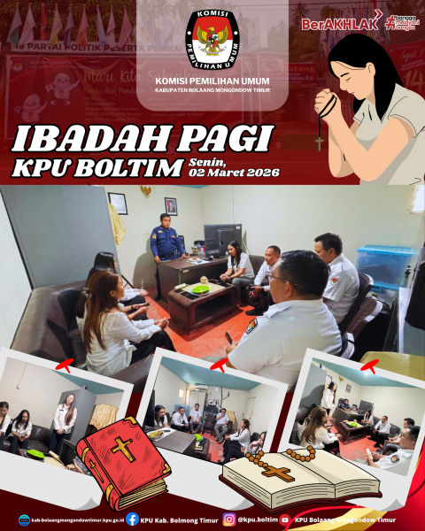 BOLTIM — Komisi Pemilihan Umum Kabupaten Bolaang Mongondow Timur (KPU Boltim) melaksanakan ibadah rutin bagi pegawai beragama Kristen di lingkungan kantor KPU Boltim, pada senin 02/03/2026 bertempat di Ruangan Sekretaris KPU Boltim. Ibadah yang diikuti oleh pegawai Kristen tersebut berlangsung dengan khidmat dan penuh sukacita, ibadah juga diisi dengan renungan firman Tuhan yang terdapat dalam 1 Yohanes Pasal 1 ayat 5 sampai dengan ayat 10 dengan judul “Allah Adalah Terang”. Sekretaris Komisi Pemilihan Umum Kabupaten Bolaang Mongondow Timur Dolfie R.S Kereh, S.Sos, M.Si menyampaikan bahwa kegiatan ibadah rutin ini menjadi wadah untuk mempererat kebersamaan serta memperkuat nilai-nilai keimanan dan taqwa kepada Tuhan Yang Maha Esa. “Ibadah rutin ini tidak hanya menjadi sarana mendekatkan diri kepada Tuhan, tetapi juga memperkuat komitmen dalam bekerja secara profesional, jujur, dan bertanggung jawab,” ujarnya. ....