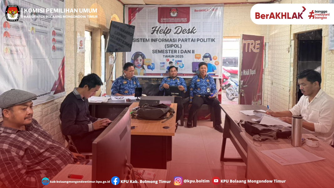 Komisi Pemilihan Umum (KPU) Kabupaten Bolaang Mongondow Timur melaksanakan Rapat Pleno Rutin (RPR) bertempat di ruang rapat kantor KPU Boltim. Kegiatan dipimpin langsung oleh Ketua KPU Boltim, Rusmin Mamonto, dan dihadiri oleh seluruh Anggota KPU: Ikal Salehe, Nugroho Lasabuda, serta Wardoyo Elias. Sekretaris KPU Boltim Dolfie Kereh, bersama seluruh para Kasubbag juga turut hadir dalam agenda tersebut.