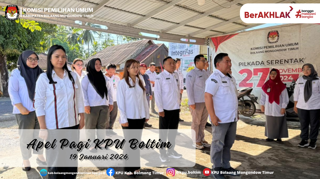 BOLTIM - Mengawali aktivitas kerja di awal pekan, Komisi Pemilihan Umum Kabupaten Bolaang Mongondow Timur (KPU Boltim) melaksanakan Apel Pagi Senin yang diikuti oleh seluruh jajaran dan pegawai Sekertariat bertempat di halaman Kantor KPU Boltim Senin, 19/01/2026.