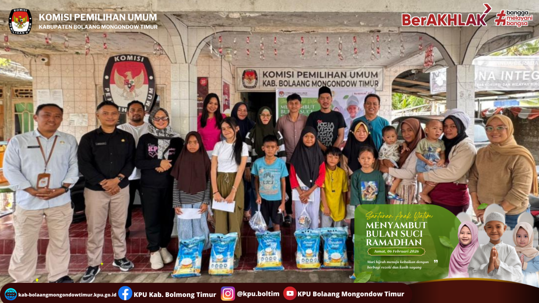 BOLTIM - Komisi Pemilihan Umum (KPU) Kabupaten Bolaang Mongondow Timur (KPU Boltim) Mengadakan kegiatan santunan anak yatim dalam rangka menyambut datangnya bulan suci Ramadhan. Kegiatan ini berlangsung di lingkungan Kantor KPU Boltim dan dihadiri oleh Ketua KPU Boltim, Sekretaris, para Kasubag, serta jajaran pegawai KPU Boltim pada Jumat, 06/02/26.