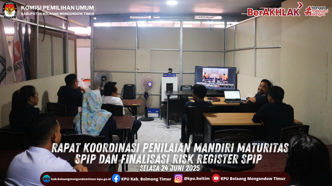 Tutuyan - Komisi Pemilihan Umum Provinsi Sulawesi Utara gelar KPU Provinsi Sulawesi Utara gelar Rapat Koordinasi Penilaian Mandiri Maturitas SPIP dan Finalisasi Risk Regster SPIP. Kegiatan ini bertujuan untuk memastikan konsistensi dan keselarasan dalam pengisian dokumen penilaian mandiri SPIP serta Risk Register di masing-masing satker, sebagai bagian dari komitmen bersama mewujudkan tata kelola pemerintahan yang bersih, transparan dan akuntabilitas. Rapat Koordinasi ini di buka langsung oleh Ketua KPU Provinsi Sulawesi Utara, Bpk. Kenly Poluan. Menjadi Narasumber dalam Rapat Koordinasi ini, Bpk. Meidy Tinangon sebagai Kepala Divisi HUkum dan Pengawasan KPU Provindsi Sulawesi Utara. Beliau menekankan bahwa SPIP bukan sekedar kewajiban administrative, melainkan bagian dari budaya kerja organisasi yang menuntut integritas, akuntabiltas, dan komitmen kolektif seluruh jajaran. Hadir pula sekretaris KPU Prov. Sulawesi Utara Bpk. Meydi Malonda yang juga memberikan arahan pentngnya menyamakan persepsi dan penyelarasan langkah dalam menyusun dokumen penilaian SPIP dan Risk Register secara akurat dan bertanggungjawab. Giat ini dihadiri secara daring dan diikuti oleh Komisioner, Sekretaris, para Kasubbag, staf di subbag Hukum dan operator SPIP. Selasa, 24 Juli 2025