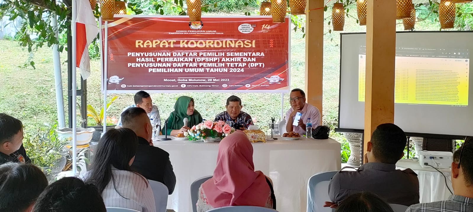 Sabtu (20/05) KPU Boltim melaksanakan Rapat Koordinasi Penyusunan Daftar Pemilih Sementara Hasil Perbaikan (DPSHP) Akhir dan Persiapan Daftar Pemilih Tetap (DPT) untuk Pemilu 2024 turut hadir dalam kegiatan dari dinas capil Boltim, Bawaslu Boltim dan PPK se-kab.Boltim Rapat dibuka oleh kadiv parmas terry suoth mewakili ketua kpu kab Boltim, dilanjutkan penyampaian dari kadiv data adchilni abukasim, sebagai tindak lanjut Surat Edaran Ketua KPU RI Nomor 497/TIM.01-SD/14/2023 perihal Penyusunan Daftar Pemilih Sementara Hasil Perbaikan (DPSHP) Akhir dan Persiapan Daftar Pemilih Tetap (DPT) untuk Pemilu 2024. Dalam arahan ya kadiv data menyampaikan proses pemutakhiran data pemilih yg sdh pada tahapan akhir menjelang menetapkan DPT pada Juni mendatang PPK diminta terus melakukan pencermatan data bersama PPS, terutama data ganda, data potensial nonton KTP, data invalid sebelum rekapitulasi di tkt PPS pada tgl 1-2 Juni 2023.Adapun dari pihak capil bersedia membantu mengecek data2 yg sudah di serahkan oleh KPU beberapa waktu lalu u memastikan para pemilih memang warga boltim dan sudah mengantongi KTP boltim.