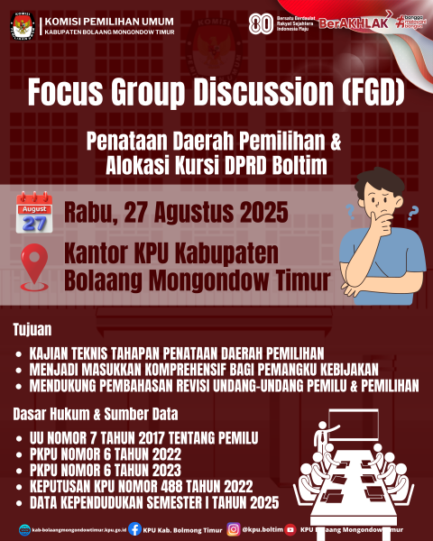Tutuyan – Komisi Pemilihan Umum (KPU) Kabupaten Bolaang Mongondow Timur akan melaksanakan Focus Group Discussion (FGD) Penataan Daerah Pemilihan dan Alokasi Kursi Anggota DPRD Kabupaten Bolaang Mongondow Timur pada Rabu, 27 Agustus 2025, bertempat di Kantor KPU Boltim. Kegiatan ini menindaklanjuti surat dinas Ketua KPU Republik Indonesia Nomor: 1109/PL.01-SD/06/2025 tanggal 26 Juni 2025, perihal Penjelasan Pelaksanaan Kegiatan Pasca Pemilu dan Pemilihan. FGD tersebut dimaksudkan sebagai bahan kajian teknis tahapan penataan daerah pemilihan pada Pemilu yang akan datang. Selain itu, hasil diskusi diharapkan dapat menjadi masukan komprehensif bagi para pemangku kebijakan dalam rangka pembahasan revisi Undang-Undang Pemilu dan Pemilihan. Adapun dasar hukum serta sumber data yang digunakan dalam FGD antara lain: Undang-Undang Nomor 7 Tahun 2017 tentang Pemilu PKPU Nomor 6 Tahun 2022 tentang Penataan Daerah Pemilihan dan Alokasi Kursi DPRD Kabupaten/Kota PKPU Nomor 6 Tahun 2023 tentang Daerah Pemilihan dan Alokasi Kursi DPR, DPRD Provinsi, dan DPRD Kabupaten/Kota dalam Pemilu 2024 Keputusan KPU Nomor 488 Tahun 2022 tentang Pedoman Teknis Penataan Daerah Pemilihan dan Alokasi Kursi DPRD Kabupaten/Kota Data Kependudukan Semester I Tahun 2025 Melalui kegiatan ini, KPU Boltim berkomitmen untuk terus menghadirkan kajian dan inovasi dalam penyelenggaraan Pemilu yang berkualitas, transparan, dan demokratis.