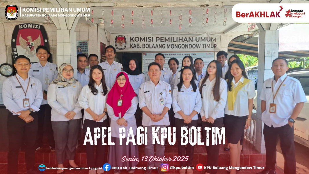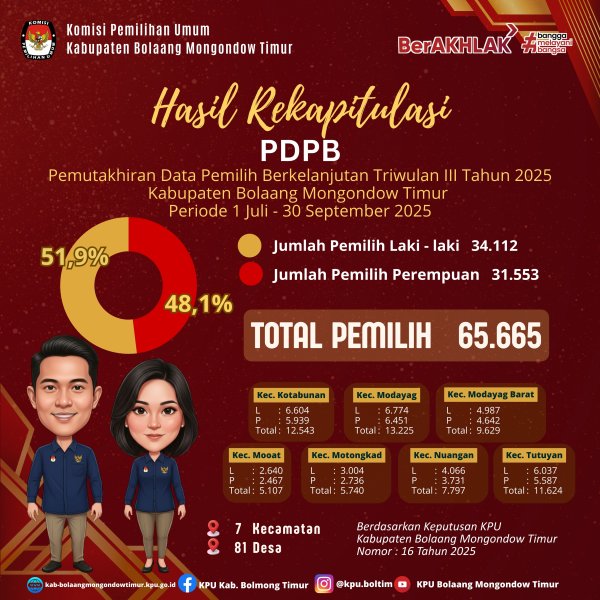 Komisi Pemilihan Umum (KPU) Kabupaten Bolaang Mongondow Timur melalui Sub Bagian Perencanaan, Data & Informasi menyelenggarakan Rapat Pleno Pemutakhiran Data Pemilih Berkelanjutan (PDPB) Triwulan III Tahun 2025. Kamis, 2 Oktober 2025, Kegiatan ini dihadiri oleh Ketua, Anggota, dan Sekretaris KPU Kab.Boltim, serta perwakilan Pemerintah Kab. Boltim (Kesbangpol dan Disdukcapil), Bawaslu Kab. Boltim dan Perwakilan Polres Boltim. Rapat Pleno dibuka oleh pimpinan rapat, Ketua KPU Bolaang Mongondow Timur, kemudian diserahkan kepada Ketua Divisi Perencanaan, Data dan Informasi untuk memandu proses Pembacaan Rekapitulasi Pemutakhiran Data Pemilih Berkelanjutan (PDPB) Triwulan III Tahun 2025, Ketua KPU Bolaang Mongondow Timur membacakan Rekapitulasi Hasil Pemutakhiran Data Pemilih Berkelanjutan (PDPB) kemudian meminta masukan dari Peserta Rapat Pleno. Setelah selesai pembahasan pada Rapat Koordinasi PDPB Triwulan III Tahun 2025, selanjutnya KPU Kab. Boltim Menetapkan DPB Triwulan III Tahun 2025 yang dituangkan dalam berita acara Rekapitulasi DPB Triwulan III Tahun 2025. Rapat Pleno Terbuka ini menjadi momentum penting dalam memperkuat sinergi antar instansi demi meningkatkan perolehan data pemilih berkelanjutan di Kabupaten Bolaang Mongondow Timur.