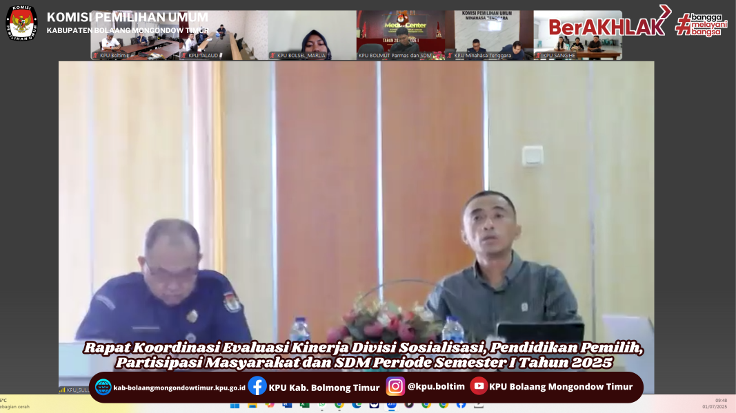 Tutuyan— Selasa, 1 Juli 2025 Komisi Pemilihan Umum (KPU) Kabupaten Bolaang Mongondow Timur mengikuti Rapat Koordinasi Evaluasi Kinerja Divisi Sosialisasi, Pendidikan Pemilih, Partisipasi Masyarakat, dan Sumber Daya Manusia (Sosdiklih, Parmas, dan SDM) untuk periode Semester I Tahun 2025. Kegiatan ini digelar KPU Provinsi Sulawesi Utara secara daring melalui platform Zoom Meeting. Rapat koordinasi ini dibuka secara resmi oleh Kepala Divisi Sosdiklih, Parmas, dan SDM KPU Provinsi Sulawesi Utara, Awaludin Umbola, yang dalam sambutannya menegaskan pentingnya konsistensi dan sinergi antar seluruh jajaran KPU di tingkat provinsi maupun kabupaten/kota dalam menjalankan program sosialisasi dan pendidikan pemilih, serta penguatan partisipasi masyarakat dan pengelolaan Website dan media sosial untuk memberikan informasi kepada masyarakat. Dalam arahannya, Awaludin Umbola juga menekankan pentingnya optimalisasi pemanfaatan media digital oleh jajaran KPU kabupaten/kota. “KPU Kabupaten/Kota harus lebih memaksimalkan website dan media sosial untuk memberikan informasi kepada masyarakat tentang kerja-kerja yang ada di lingkungan KPU,” tegasnya. Agenda ini menjadi bagian dari upaya KPU Provinsi untuk melakukan pemantauan, evaluasi, dan penyamaan persepsi terhadap capaian kinerja serta rencana strategis di bidang Sosdiklih, Parmas, dan SDM. Rapat koordinasi diikuti oleh jajaran Divisi Sosdiklih, Parmas, dan SDM dari KPU kabupaten/kota se-Sulawesi Utara, serta staf sekretariat yang menangani bidang terkait. Melalui kegiatan ini, diharapkan koordinasi dan kinerja program-program KPU di bidang Sosialisasi dan SDM dapat terus ditingkatkan secara efektif, adaptif, dan berkelanjutan demi mendorong partisipasi masyarakat dalam setiap tahapan demokrasi.