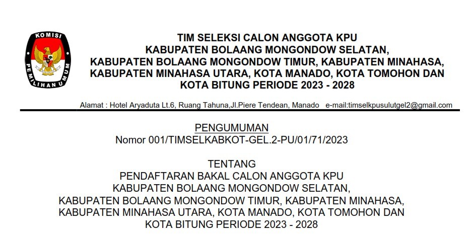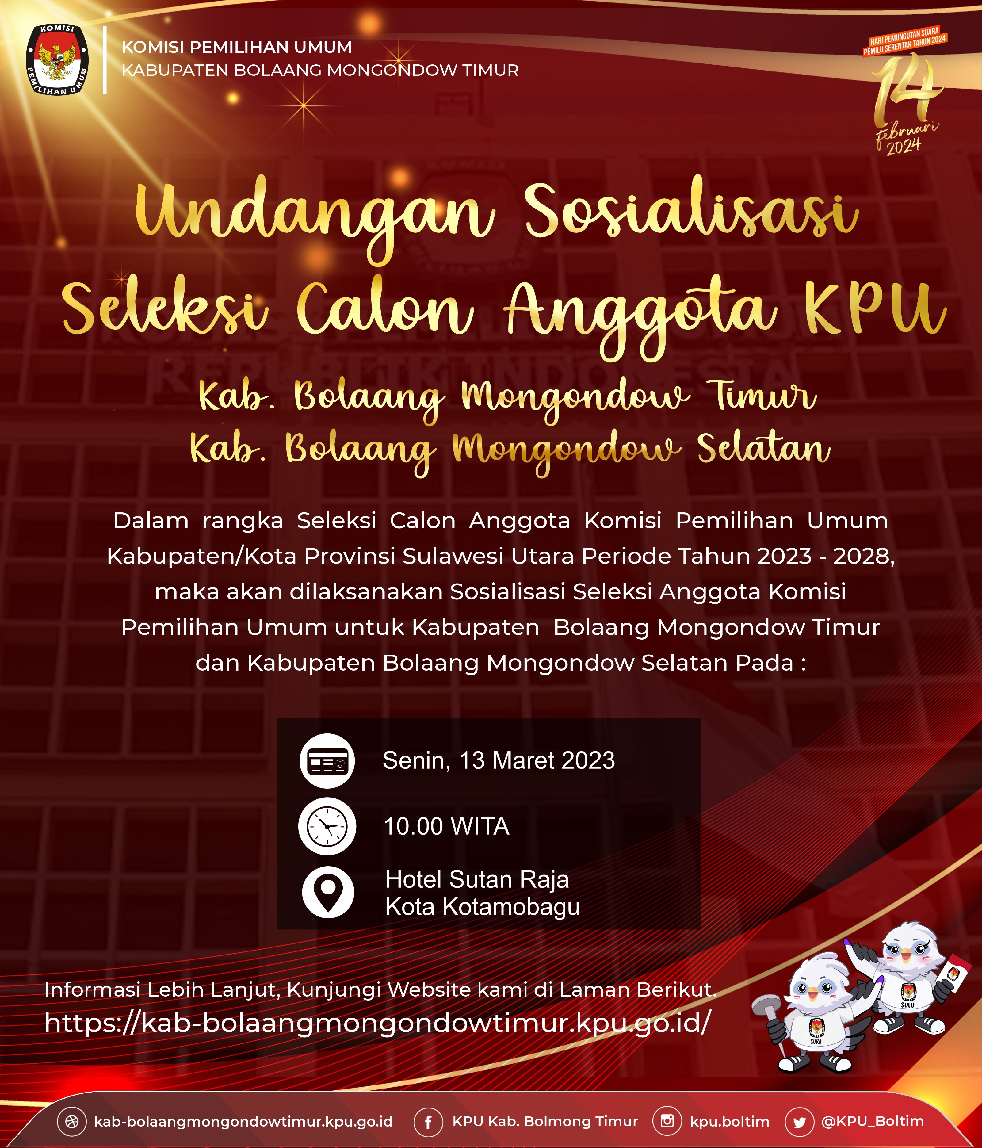 Undangan Sosialisasi Seleksi Calon Anggota Komisi Pemilihan Umum untuk Kabupaten Bolaang Mongondow Timur dan Kabupaten Bolaang Mongondow Selatan Minggu, 12 Maret 2023 07:00 97 Selengkapnya klik Tautan Berikut. Baca Selengkapnya