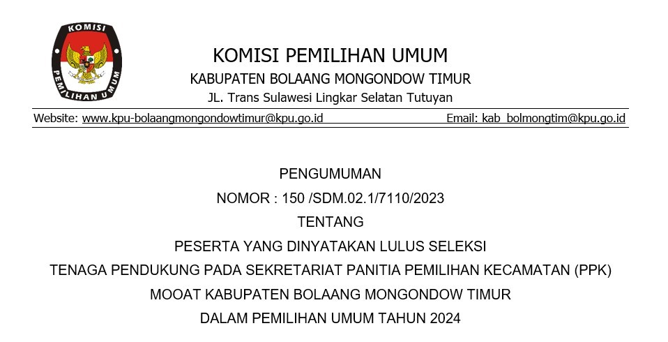 Peserta Yang Dinyatakan Lulus Seleksi Tenaga Pendukung Pada Sekretariat Panitia Pemilihan Kecamatan (PPK) Mooat Kabupaten Bolaang Mongondow Timur Dalam Pemilihan Umum Tahun 2024 Sabtu, 11 Maret 2023 07:00 111 Selengkapnya Klik Tautan Berikut. Baca Selengkapnya