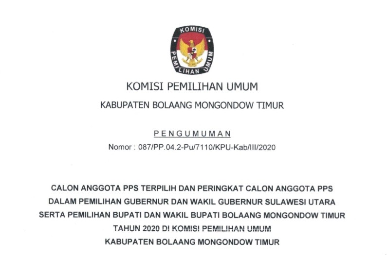 Pengumuman Calon Anggota PPS Terpilih Dalam Pemilihan Gubernur dan Wakil Gubernur Sulawesi Utara Serta Pemilihan Bupati dan Wakil Bupati Bolaang Mongondow Timur Tahun 2020 Minggu, 15 Maret 2020 00:00 53 Info lebih lengkap silakan klik tautan di bawah ini. Download Pengumuman Baca Selengkapnya