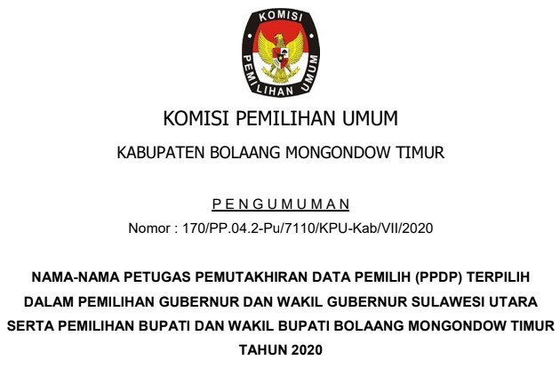 Pengumuman Nama - Nama Petugas Pemutakhiran Data Pemilih (PPDP) Terpilih Untuk Pemilihan Bupati dan Wakil Bupati Bolaang Mongondow Timur Tahun 2020 Rabu, 15 Juli 2020 00:00 42 Info lebih lengkap silakan klik tautan di bawah ini. Download Pengumuman Baca Selengkapnya