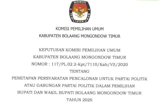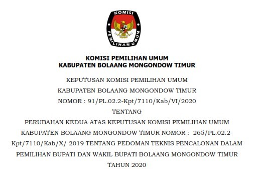 Pedoman Teknis Pencalonan Dalam Pemilihan Bupati dan Wakil Bupati Bolaang Mongondow Timur Tahun 2020 Senin, 27 Juli 2020 00:00 58 Info lebih lengkap silakan klik tautan di bawah ini. Download Pengumuman Baca Selengkapnya