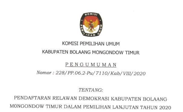 Pengumuman Pendaftaran Relawan Demokrasi Kab. Bolaang Mongondow Timur Tahun 2020 Kamis, 27 Agustus 2020 00:00 43 Info lebih lengkap silakan klik tautan di bawah ini. Download Pengumuman Baca Selengkapnya