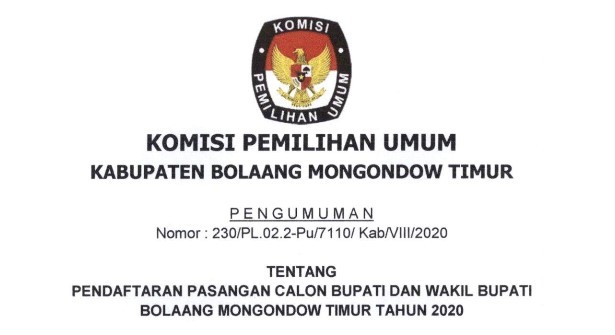 Pendaftaran Pasangan Calon Bupati dan Wakil Bupati Bolaang Mongondow Timur 2020 Jumat, 28 Agustus 2020 00:00 44 Info lebih lengkap silakan klik tautan di bawah ini. Download Pengumuman Baca Selengkapnya