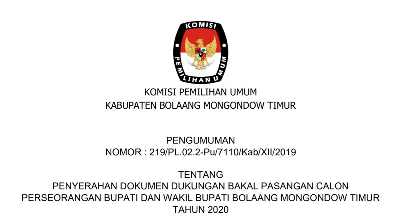 Penyerahan Dokumen Dukungan Bakal Pasangan Calon Perseorangan Bupati dan Wakil Bupati Bolaang Mongondow Timur Tahun 2020 Selasa, 03 Desember 2019 00:00 384 Info lebih lengkap silakan klik tautan di bawah ini. Download Pengumuman Baca Selengkapnya