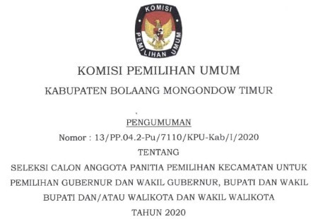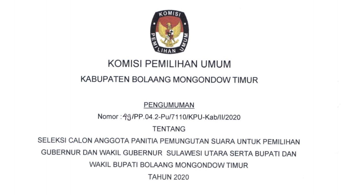 PENGUMUMAN SELEKSI CALON ANGGOTA PPS UNTUK PEMILIHAN GUBERNUR DAN WAKIL GUBERNUR SULAWESI UTARA SERTA BUPATI DAN WAKIL BUPATI BOLAANG MONGONDOW TIMUR TAHUN 2020 Sabtu, 15 Februari 2020 00:00 344 Info lebih lengkap silakan klik tautan di bawah ini. Download Pengumuman Download Formulir Baca Selengkapnya