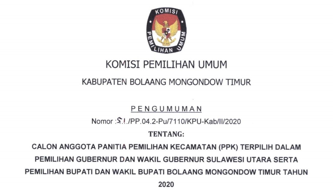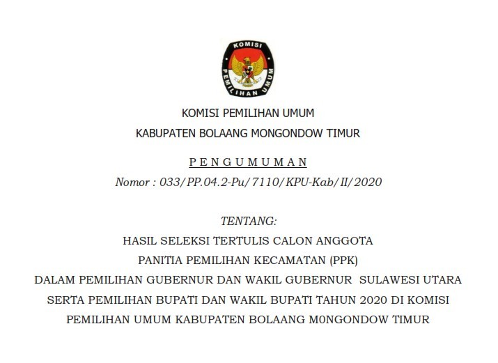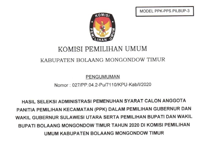 Pengumuman Hasil Seleksi Administrasi Calon Panitia Pemilihan Kecamatan (PPK) Kabupaten Bolaang Mongondow Timur 2020 Selasa, 28 Januari 2020 00:00 357 Info lebih lengkap silakan klik tautan di bawah ini. Download Pengumuman Baca Selengkapnya