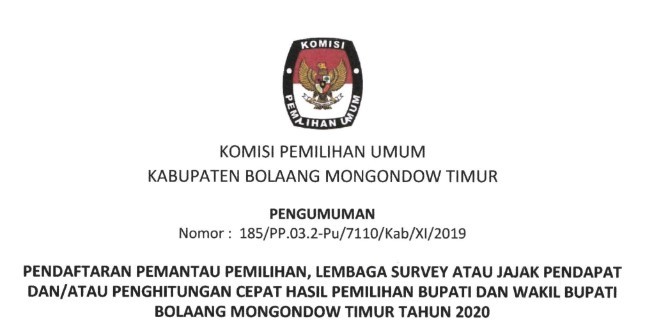 Pendaftaran Pemantau Pemilihan, Lembaga Survey Atau Jajak Pendapat Dan/Atau Penghitungan Cepat Hasil Pemilihan Bupati Dan Wakil Bupati Bolaang Mongondow Timur Tahun 2020 Jumat, 01 November 2019 00:00 384 Download Pengumuman Lengkap di link berikut. Download Baca Selengkapnya