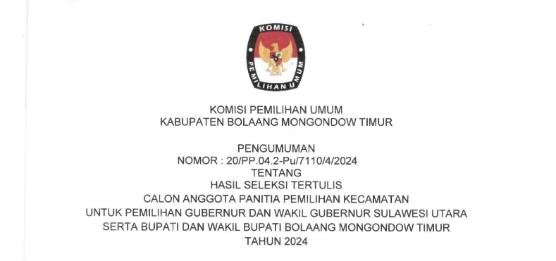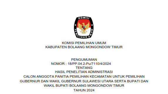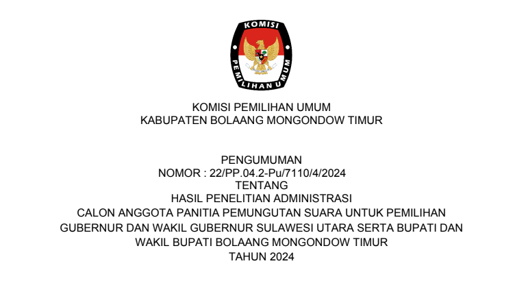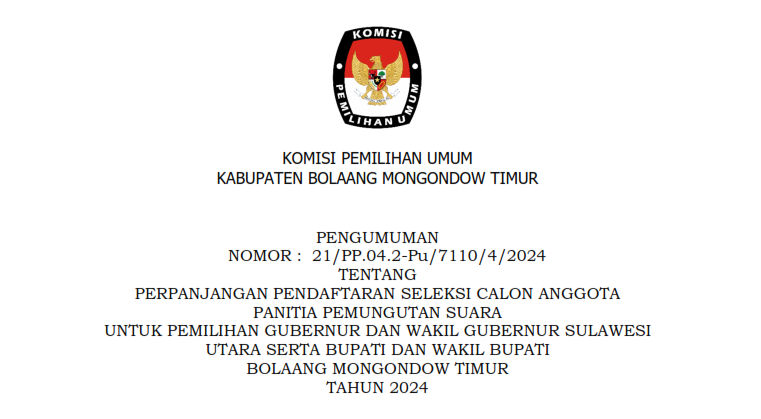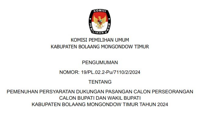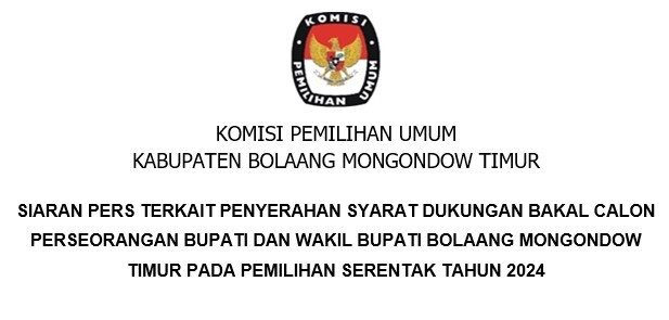 Berdasarkan PKPU Nomor 2 Tahun 2024 Tentang Tahapan Dan Jadwal Pemilihan Gubernur Dan Wakil Gubernur, Bupati Dan Wakil Bupati, Serta Walikota Dan Wakil Walikota Tahun 2024 dan Keputusan Komisi Pemilihan Umum Nomor 532 Tahun 2024 Tentang Pedoman Teknis Pemenuhan Syarat Dukungan Pasangan Calon Perseorangan Dalam Pemilihan Gubernur Dan Wakil Gubernur, Bupati Dan Wakil Bupati, Serta Walikota Dan Wakil Walikota Tahun 2024, Komisi Pemilihan Umum KPU Kabupaten Bolaang Mongondow Timur Tertanggal 5 Mei 2024 Telah Mengeluarkan Pengumuman Nomor 19/PL.02.2-Pu/7110/2/2024 Tentang Pemenuhan Persyaratan Dukungan Pasangan Calon Perseorangan Calon Bupati Dan Wakil Bupati Kabupaten Bolaang Mongondow Timur Tahun 2024. Bahwa Setelah Diumumkan, Berdasarkan Jadwal Dan Tahapan Pemilihan, KPU Kabupaten Bolaang Mongondow Timur Membuka Penerimaan Persyaratan Dukungan Bakal Calon Perseorangan Bupati Dan Wakil Bupati Bolaang Mongondow Timur, Mulai Rabu, 8 Mei – Sabtu, 11 Mei Pukul 08.00 – 16.00 WITA dan Minggu, 12 Mei 2024 Pukul 08.00 – 23.59 WITA Bahwa Selama Kurun Waktu Penerimaan Persyaratan Dukungan Sebagaimana Dimaksud Di Atas, KPU Kabupaten Bolaang Mongondow Timur Tidak Menerima Satupun Bakal Calon Perseorangan Yang Melakukan Penyerahan Syarat Dukungan Perseorangan Kepada KPU Kabupaten Bolaang Mongondow Timur. Senin, 13 Mei 2024 Komisi Pemilihan Umum Kabupaten Bolaang Mongondow Timur
