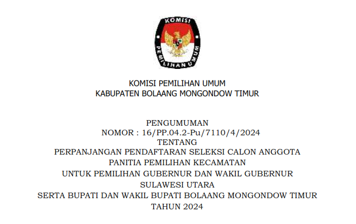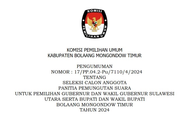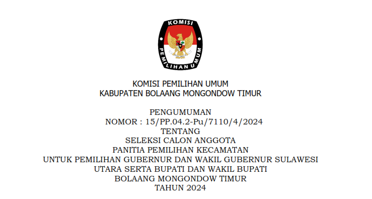 Dalam rangka pembentukan Calon Anggota Panitia Pemilihan Kecamatan untuk Pemilihan Gubernur dan Wakil Gubernur Sulawesi Utara serta Bupati dan Wakil Bupati Bolaang Mongondow Timur Tahun 2024, Komisi Pemilihan Umum Kabupaten Bolaang Mongondow Timur mengundang Warga Negara Indonesia yang memenuhi kualifikasi untuk mendaftarkan diri menjadi Panitia Pemilihan Kecamatan untuk Pemilihan Gubernur dan Wakil Gubernur Sulawesi Utara serta Bupati dan Wakil Bupati Bolaang Mongondow Timur Tahun 2024