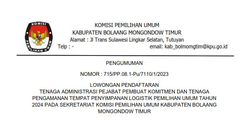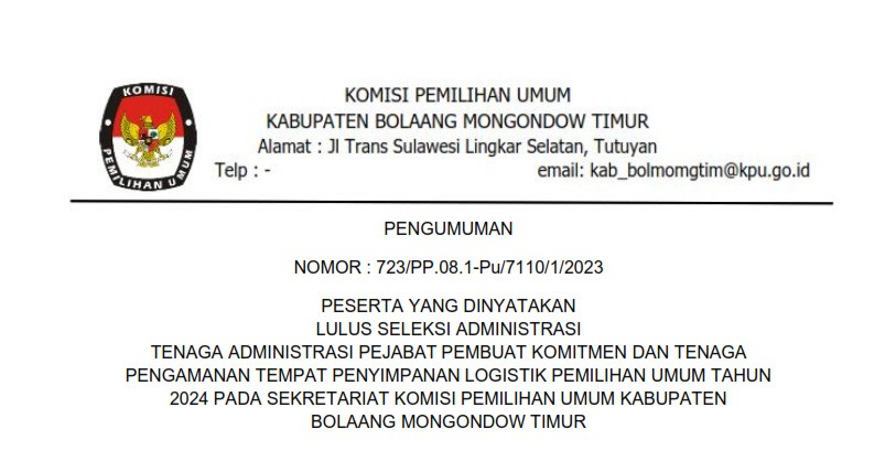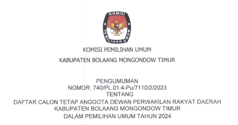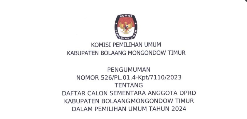 BOLTIM -- Bahwa untuk melaksanakan ketentuan Pasal 70 Peraturan KPU Nomor 10 Tahun 2023 tentang Pencalonan Anggota Dewan Perwakilan Rakyat, Dewan Perwakilan Rakyat Daerah Provinsi, dan Dewan Perwakilan Rakyat Daerah Kabupaten/Kota, KPU Kabupaten Bolaang Mongondow Timur mengumumkan Daftar Calon Sementara (DCS) Anggota DPRD Kabupaten Bolaang Mongondow Timur dan persentase keterwakilan perempuan dalam Daftar Calon Sementara (DCS) sebagaimana terlampir.